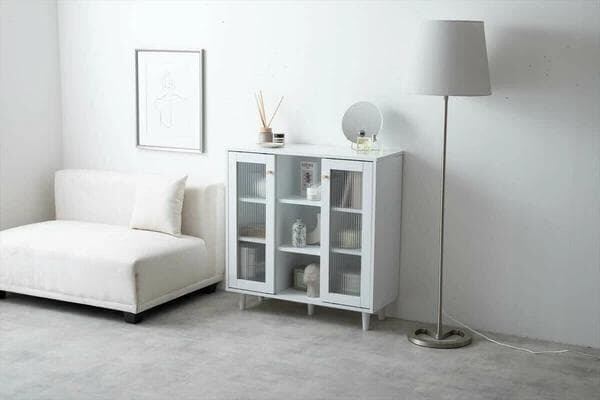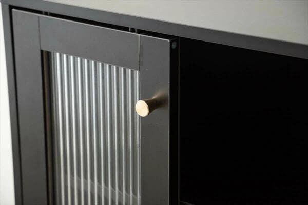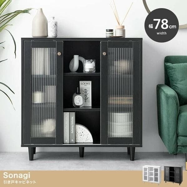 コンパクトながら機能性と美しさを兼ね備えた『Sonagi(ソナギ)』引き戸キャビネット。扉は引き戸式のため、スライドすることで見せると隠すが使い分けられます。扉のモールガラスが収納物を程よく隠すため、生活感を抑えて軽やかな空間を演出。モノトーンの本体とゴールドの取っ手が上品で、置くだけで海外インテリアのような上質な空間を実現します。