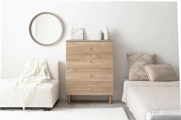 木の温かみを感じるリアルな木目調とゴールドのあしらいが目を惹く『Lucas(リュカ)』シリーズのチェスト。ワイドな引き出しは4段に分かれており、段毎に整理しながらこの1台にたっぷり収納していただけます。引き出しは簡単に取り外すことができるため中身はそのままで入れ替えることができ、衣替えをする時などに大変便利です。また、コンパクトなスリム設計のため圧迫感がなく、一人暮らしやワンルームにもぴったりなサイズ感に仕上げました。