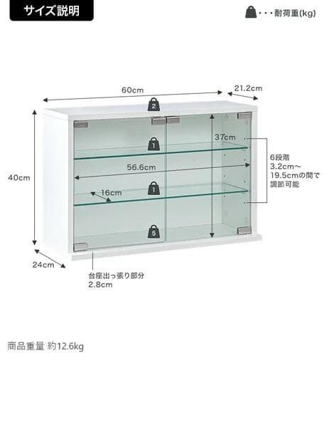 【耐荷重】天板:約2kg 、ガラス棚板(各):約1kg、底板:約5kg
