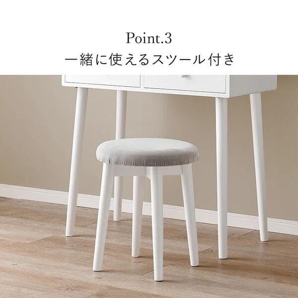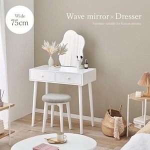 ホワイトのシンプルな本体に特徴的なウェーブミラーを合わせた大人可愛いデザインのドレッサーセット。たっぷり収納ができて、一緒に使えるスツール付と使い勝手も優れています。