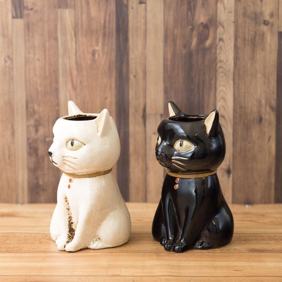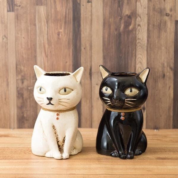 セラミックフラワーポット 白猫 黒猫 ネコ 花瓶 観葉植物 プランター