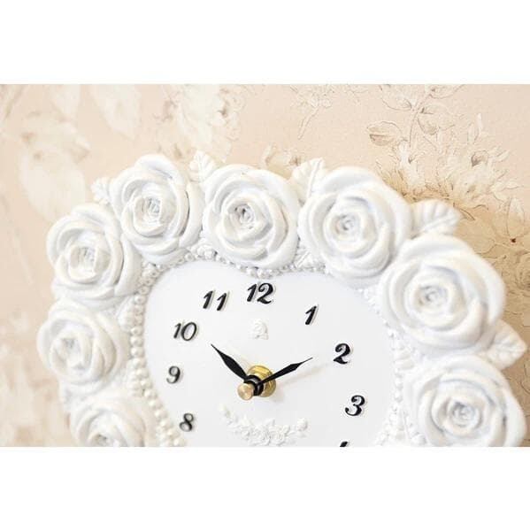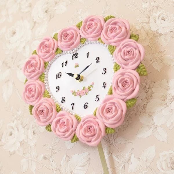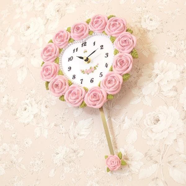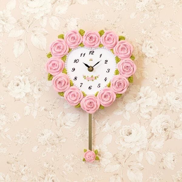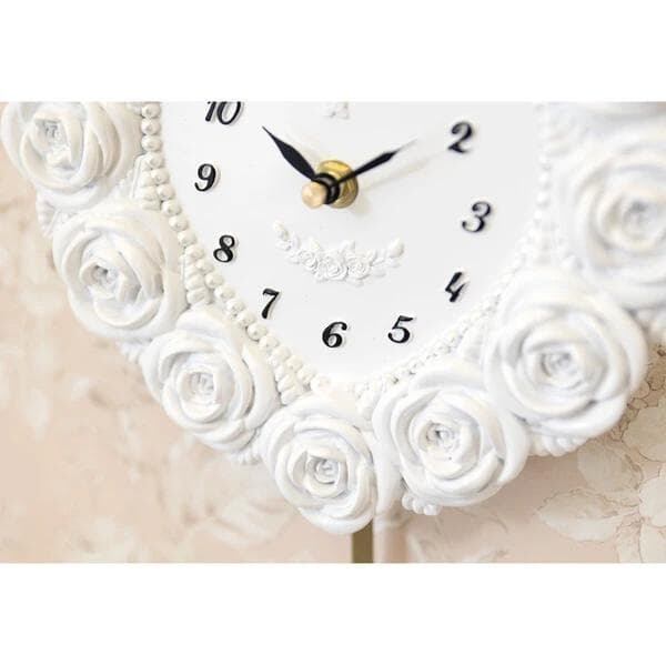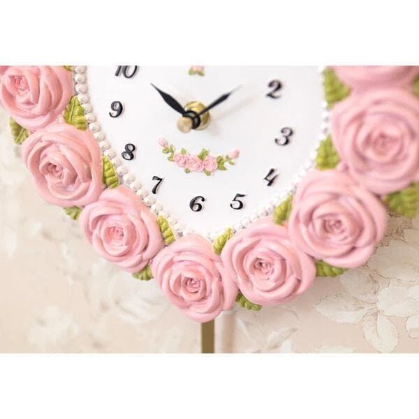 バラのモチーフをふんだんにあしらった、愛らしいハート型の振り子時計。