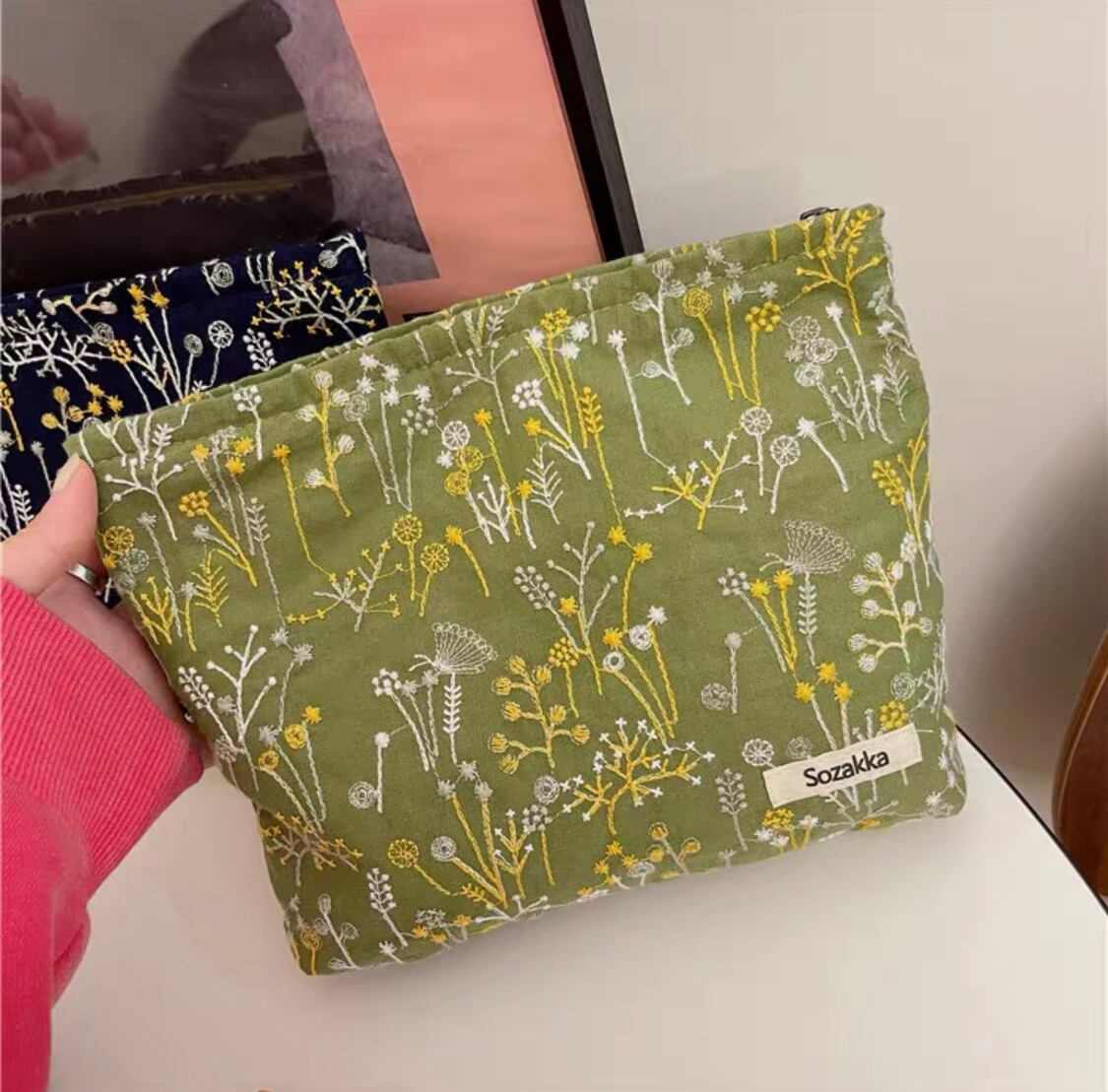 くすみカラー ポーチ 花柄 グリーン 韓国 雑貨 化粧ポーチ 通帳入れ