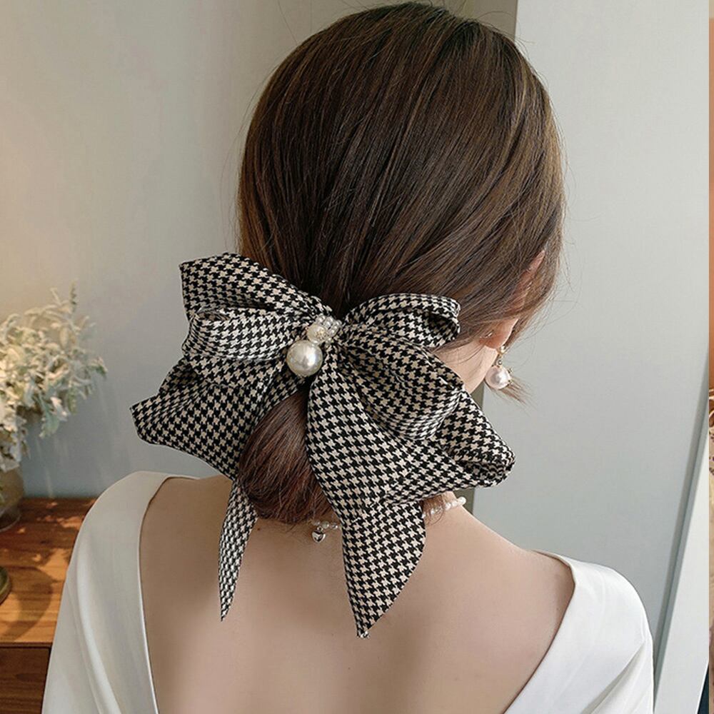 千鳥格子柄リボンバレッタ ヘアクリップ 韓国風 ヘアアレンジ