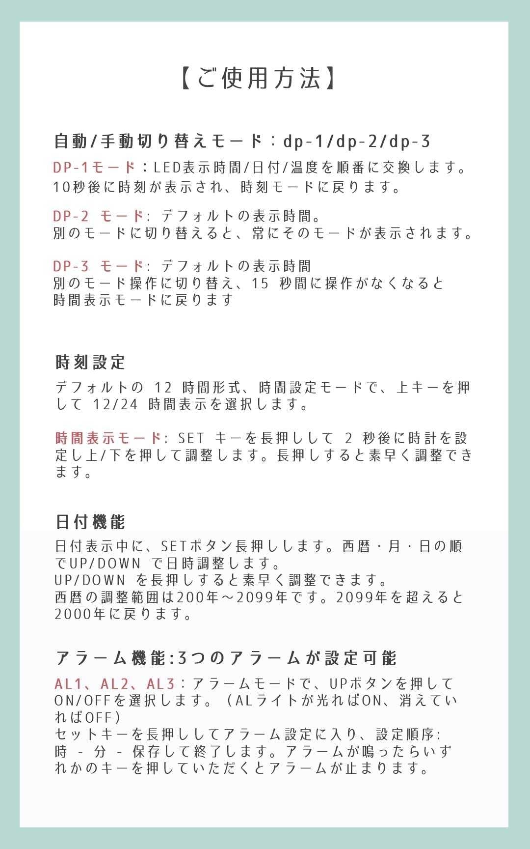 *説明書は付属しておりますが中国語と英語表記ですのでご了承の上ご購入ください。機能についての専門的なご質問、初期設定につきましてはアラームなどスタンダードな機能が付いていますので検索などしてご自身でお調べいただきますようお願い致します