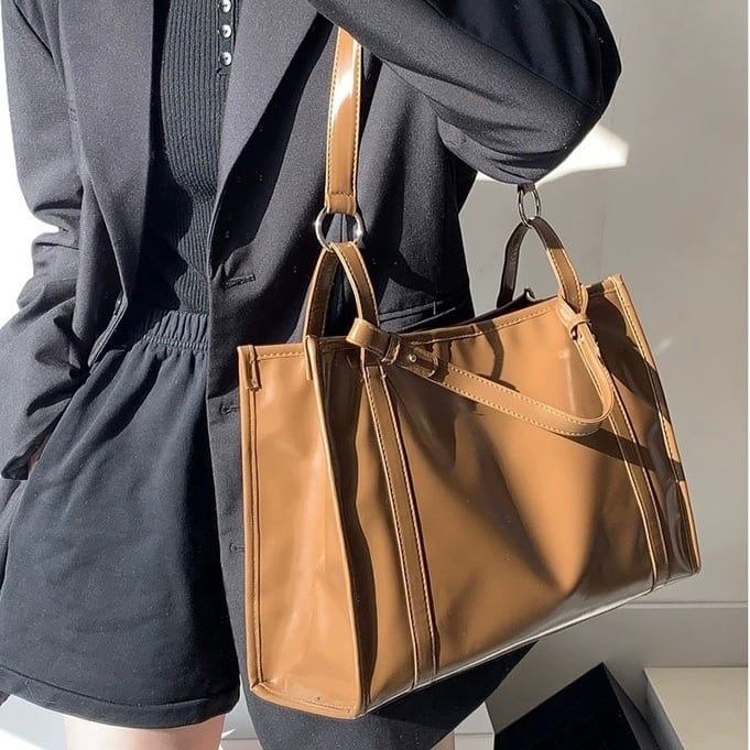 シンプル キャメル 茶色 PUレザー ハンドバッグ ショルダーバッグ 通勤通学 レディース 大容量