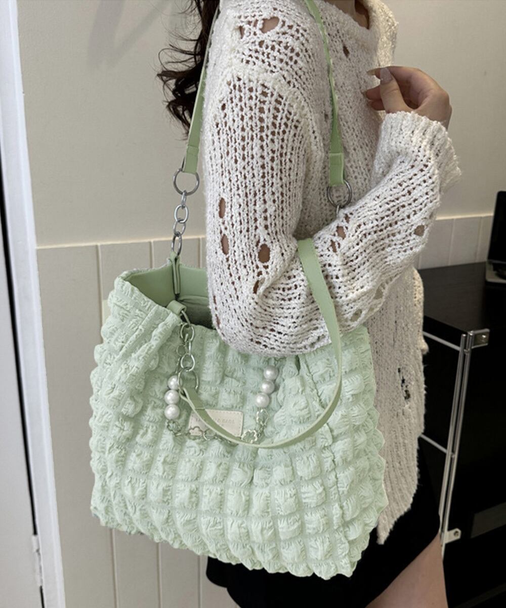 ぷくっと立体感のあるポップコーン生地がおしゃれで、持つだけでこなれ感が漂うトートバッグ